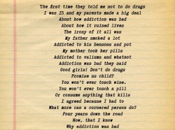 The first time they told me not to do drugs I was 15 and my parents made a big deal About how addiction was bad About how it ruined lives The irony of it all was My father smoked a lot Addicted to ... Read More